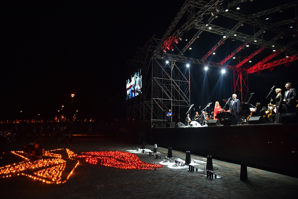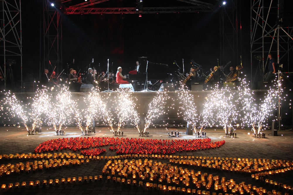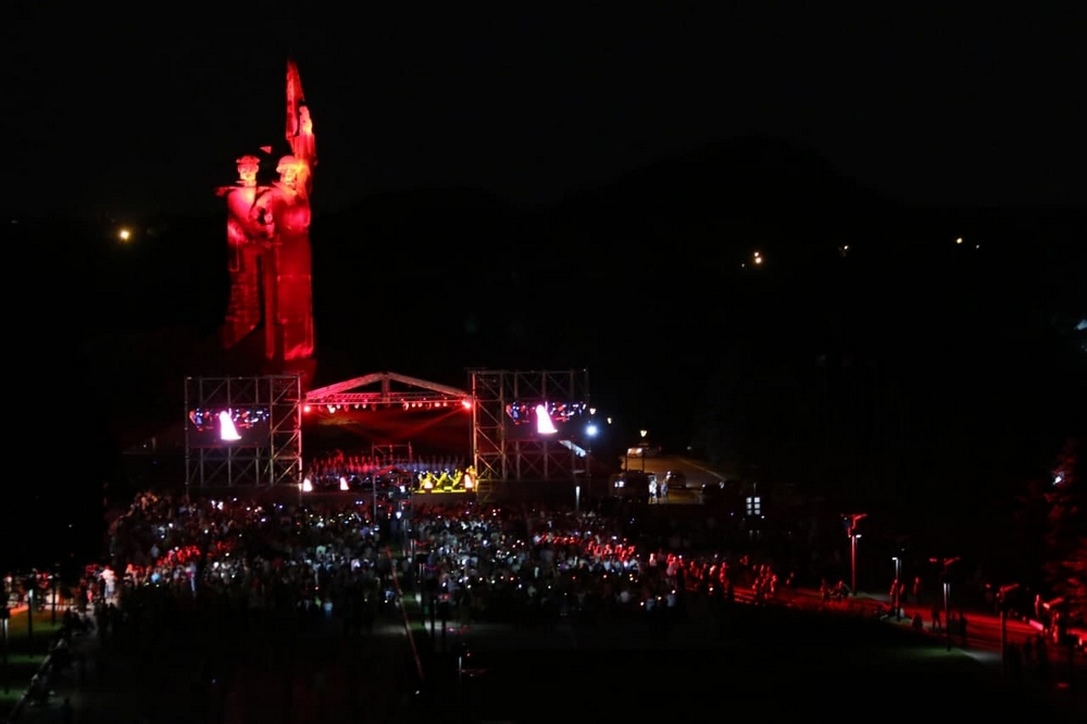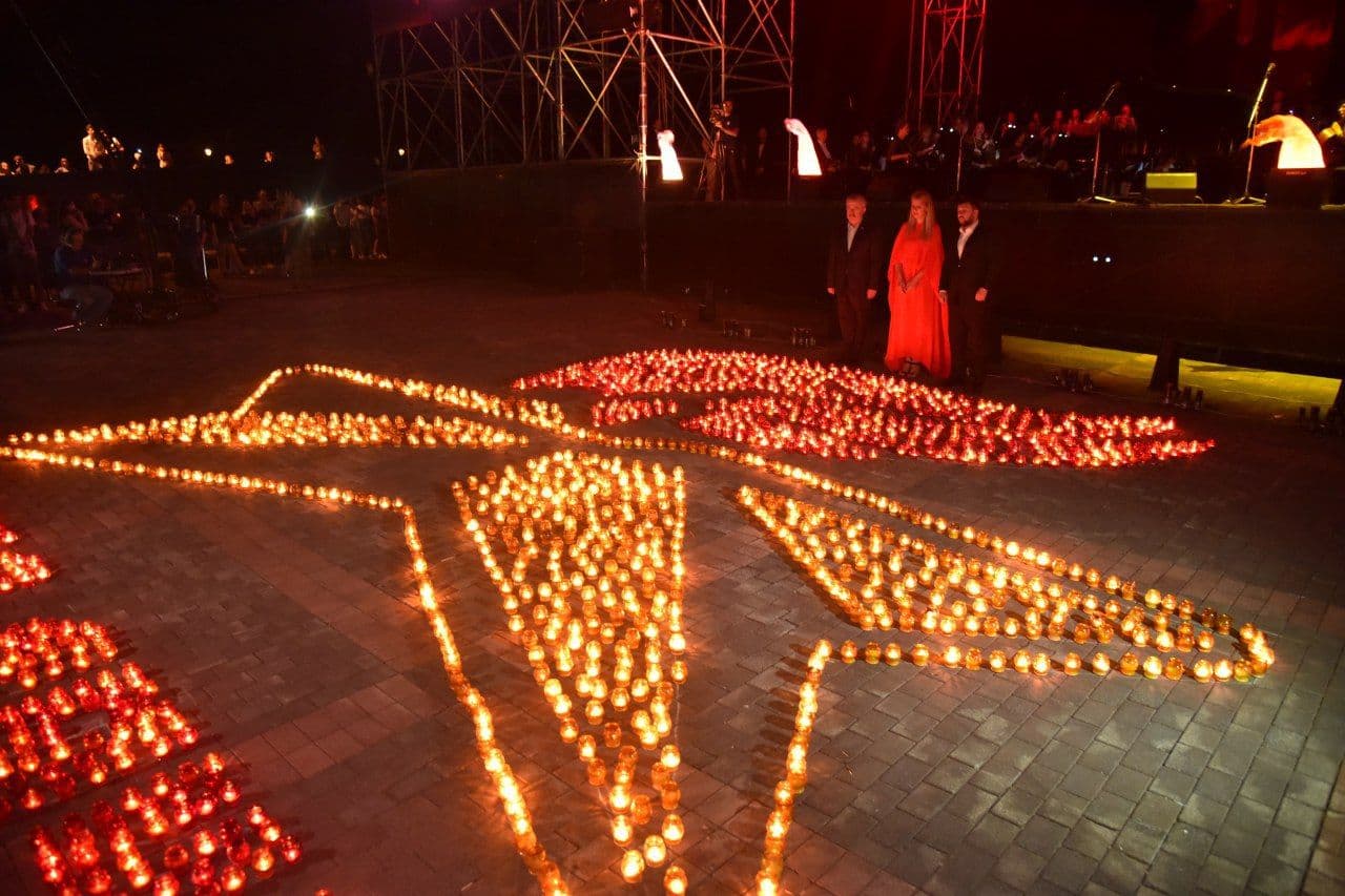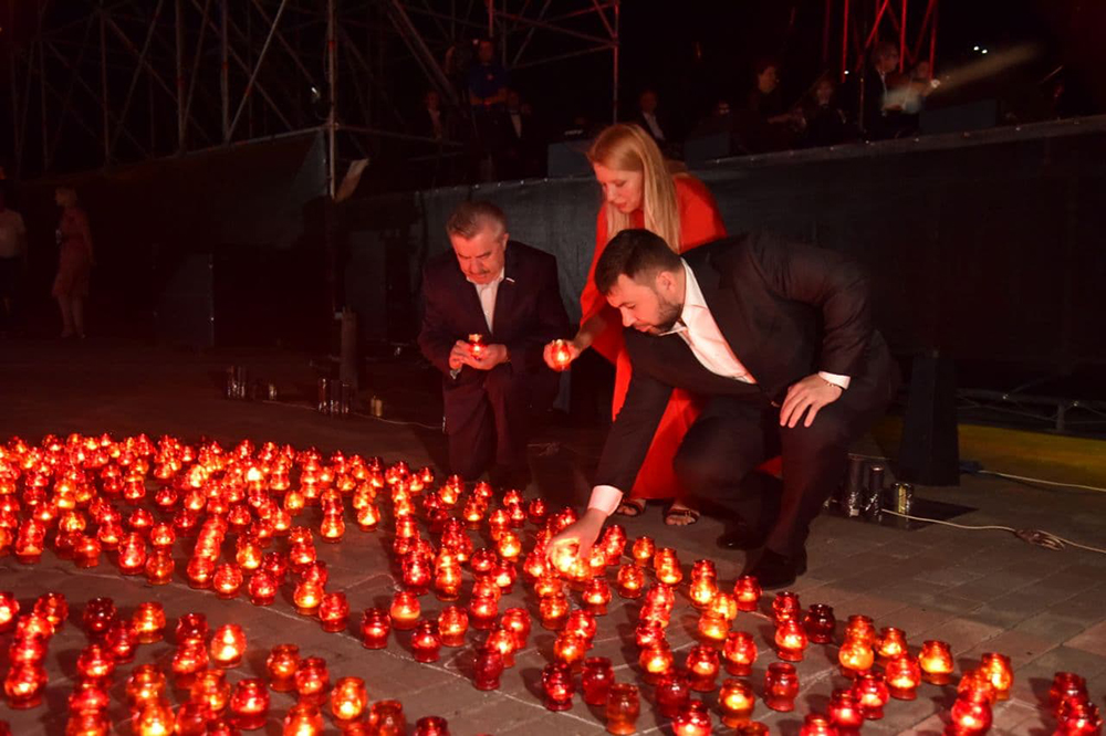 Также собравшиеся на мероприятие вместе с Денисом Пушилиным, Виктором Водолацким и Валентиной Лисицей приняли участие в масштабной акции «Свеча памяти», в рамках которой была создана инсталляция «Огненные картины войны».