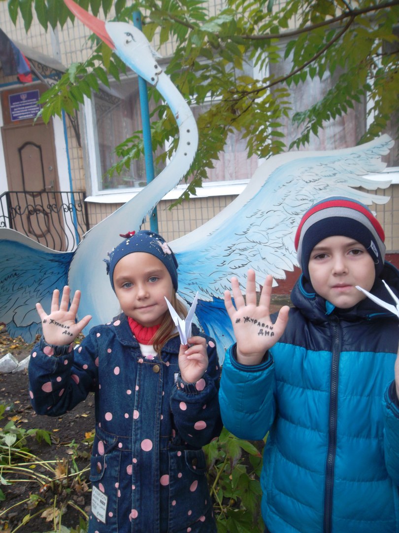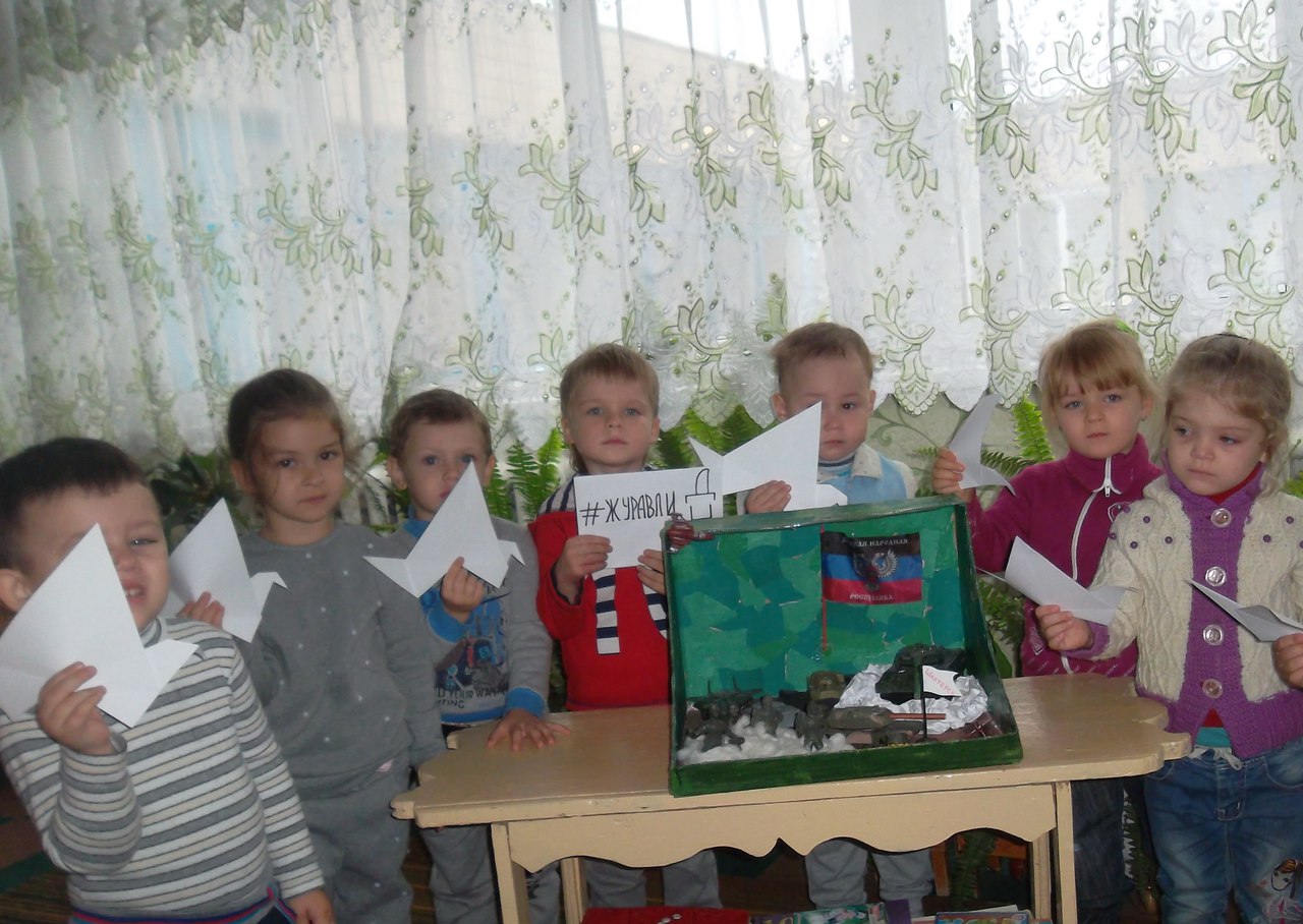 Ребята подготовительной группы приняли участие в флешмобе «Журавли ДНР». Эстафету акции подхватили дети младшей и средней групп. С интересом малыши слушали стихи и песни военных лет. Затем дети, совместно с воспитателями сделали журавликов из бумаги.