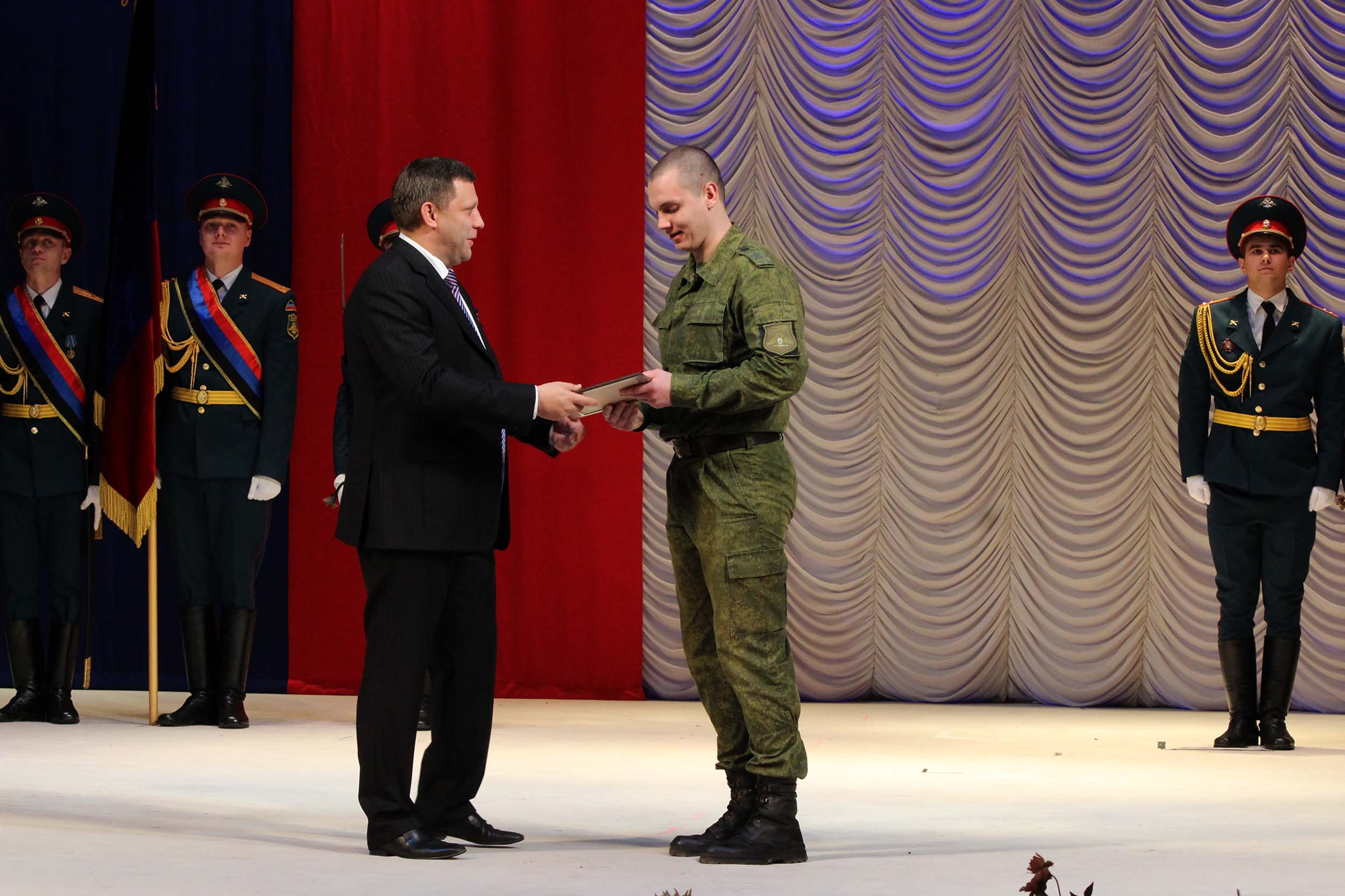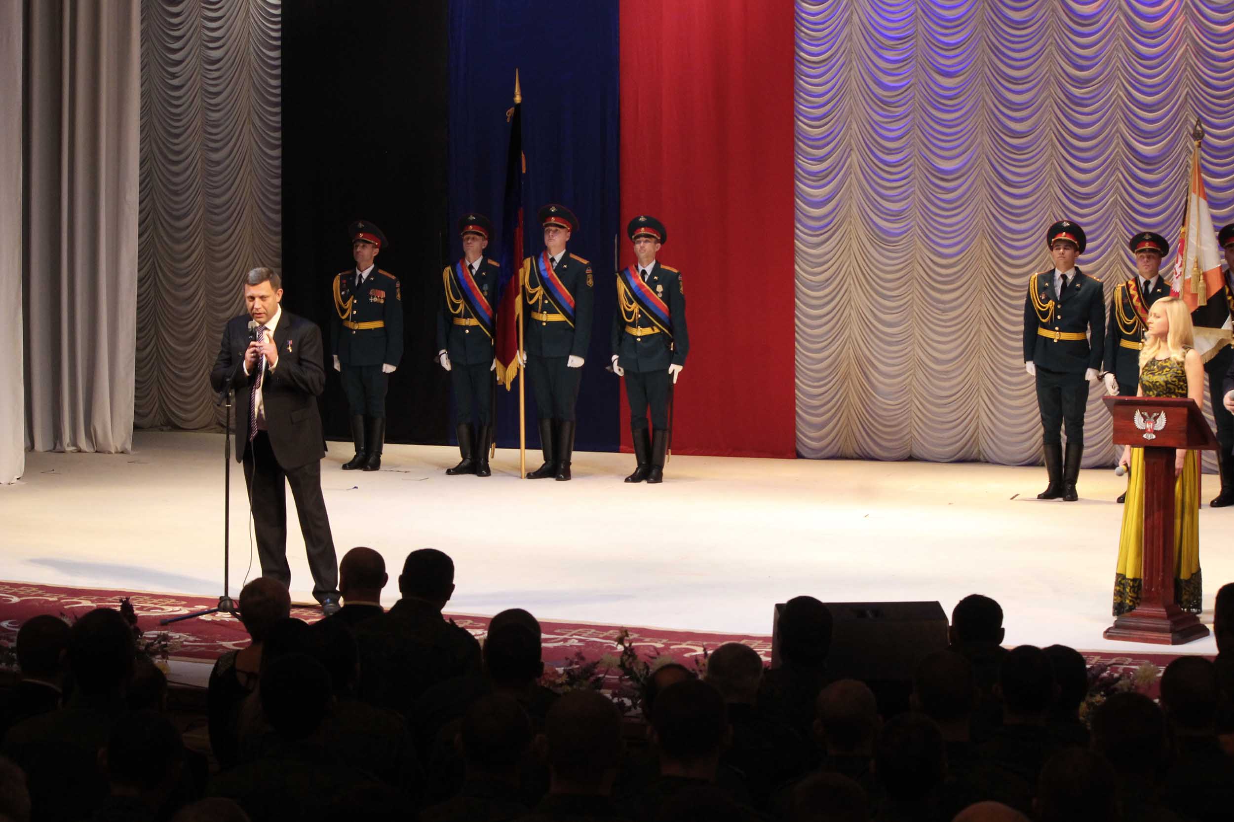 «Здравия желаю, товарищи военнослужащие! Здравствуйте, братья! Мы за очень короткий срок создали настоящую армию. Это заслуга каждого из вас! Больше спасибо за это всем военнослужащим», — сказал Александр Захарченко.