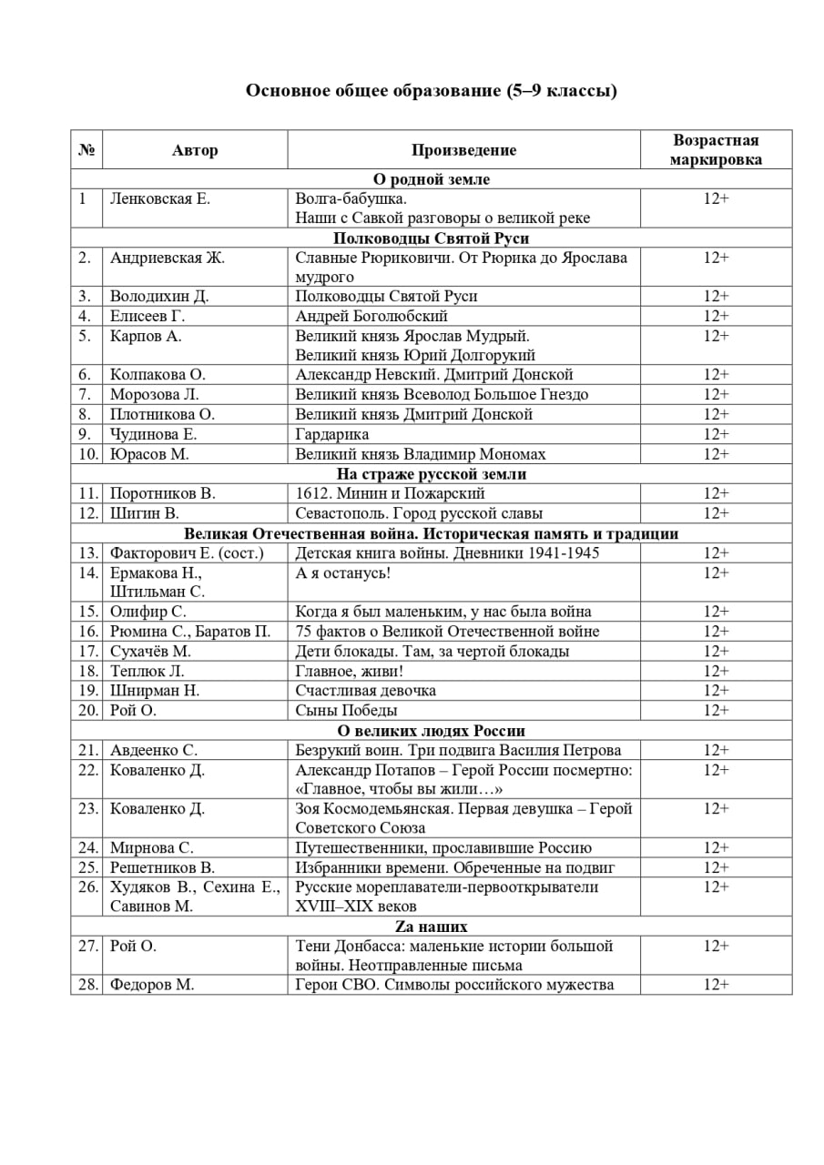 Перечень включает произведения современных авторов и ориентирован на разные возрастные группы учащихся. Книги распределены для начальной, основной и старшей школы, а сами произведения объединены в тематические разделы. Среди них – истории о родной земле, память о Великой Отечественной войне, рассказы о великих людях и защитниках Отечества.