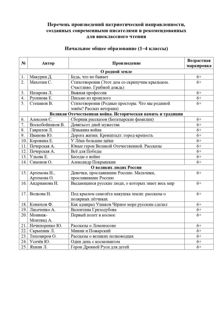 Перечень включает произведения современных авторов и ориентирован на разные возрастные группы учащихся. Книги распределены для начальной, основной и старшей школы, а сами произведения объединены в тематические разделы. Среди них – истории о родной земле, память о Великой Отечественной войне, рассказы о великих людях и защитниках Отечества.
