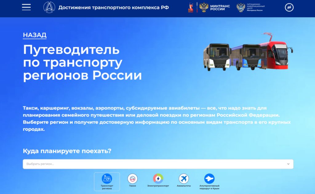 Минтранс России разработал онлайн-ресурс «Путеводитель по транспорту регионов России» для тех, кто планирует поездки по стране. Инструмент размещен на платформе «Достижения транспортного комплекса РФ».