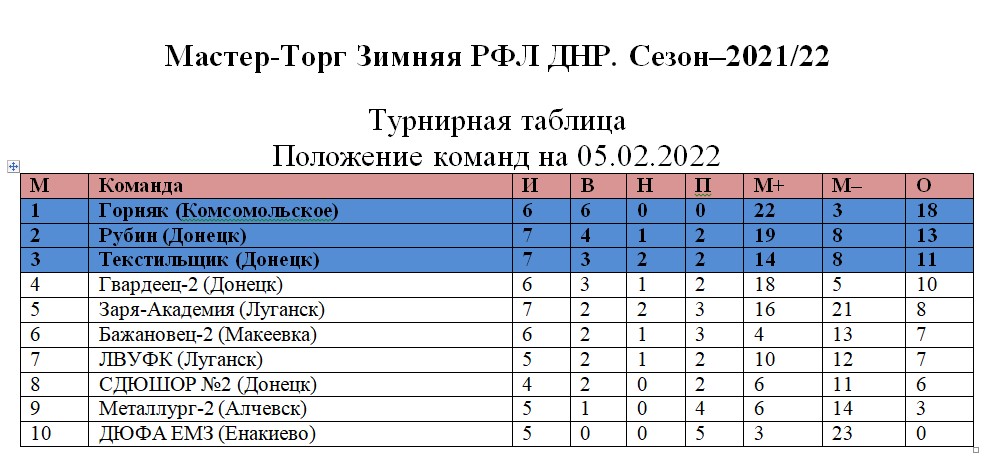 Вот такой получился в восьмом туре Зимней РФЛ ДНР триумф опыта над юношеским задором. Посмотрим, как дальше будут развиваться взаимоотношения молодых команд с возрастными. Пока же в турнирной таблице первые три места распределились в такой последовательности: «Горняк», «Рубин» и «Текстильщик».