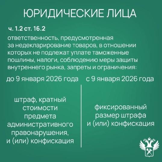 Для физических лиц теперь установлены фиксированные штрафы за недекларирование сигарет и алкоголя, если нормы их ввоза превышены не более чем на 250 сигарет и 10 литров соответственно. Также фиксированные штрафы введены для юридических лиц и индивидуальных предпринимателей за недекларивание товаров, не облагаемых пошлинами и налогами.