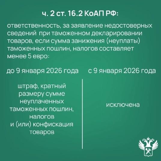 Поправки исключают ответственность за указание недостоверных сведений при декларировании, если сумма неуплаченных таможенных платежей составляет менее пяти евро. Кроме того, добросовестные декларанты освобождаются от ответственности, если они самостоятельно обнаружили и исправили недостоверные данные до выпуска товаров.